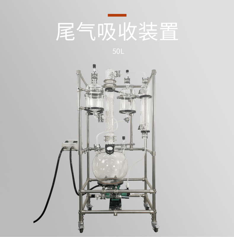 本款防爆尾氣吸收,配備三個防倒吸罐。磁力循環(huán)泵將吸收液從圓底燒瓶打入噴淋頭,從頂部落下。廢氣反方向進(jìn)入吸收柱,兩者充分接觸后,快速達(dá)成凈化。